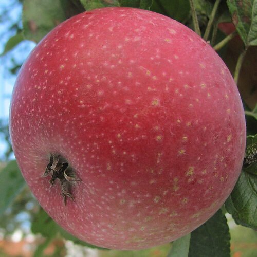 Belle pomme rouge mouchetée rappelant des étoiles. Sa chair est blanche, légèrement rosée, ferme et assez juteuse, au parfum sucrée et aromatisée. C’est une variété caractérisée par sa floraison tardive.
